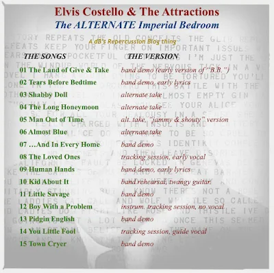 ROB SEZ: By popular demand, here's another installment in the "Classic Albums Revisited" series. (By the way, I'm not going to do alternate versions of every EC album: just a handful that I like — and for which I have rare & worthy material to share.) Recently, I posted a full live version and a full alternate version of EC's classic 1982 album. This time around, it's a single compilation album with a mix of alternate takes, band rehearsals, and live versions. As I put it together, I kept marveling at the creativity of EC's melodies & lyrics and The Attractions' musical swagger. They were crazy great! A few of the alternate takes and rehearsals are admitedly not terribly different from the master takes officially released on the album. But trainspotters like me should enjoy playing "spot the difference." This album's songs were recorded at Eden Studios, Acton, London in the fall of 1980, so I'm guessing the alternate takes were recorded at the same time. The band rehearsals might've been recorded at DJM Studios, Holborn, London a few months earlier. In some cases, my secret source only offered unexciting alternates for some of these songs. When that happened, I went looking for compelling live recordings. As with the last post, most all my master sources this time were high-quality lossy files, which explains why there's no lossless version. Please enjoy.